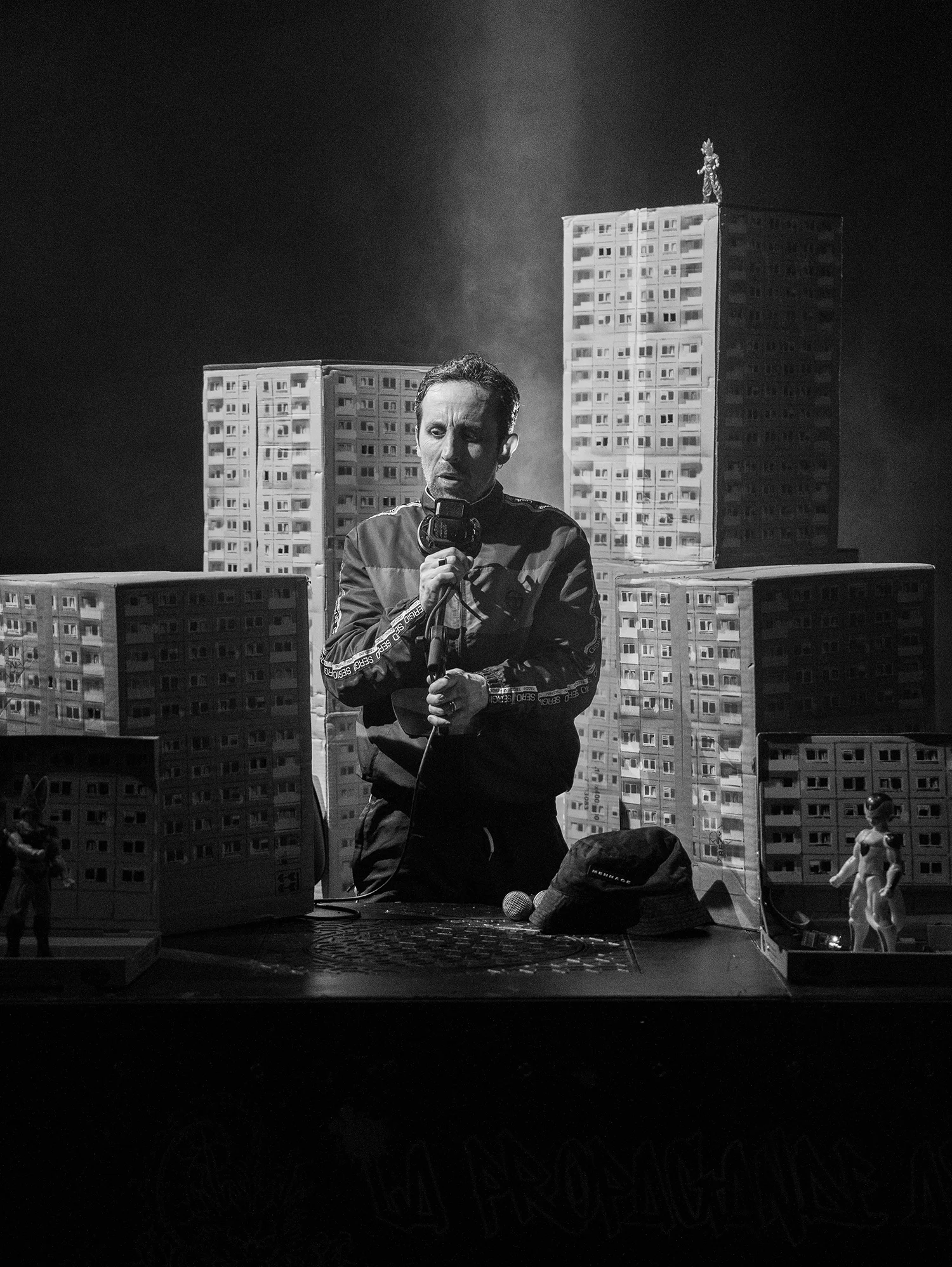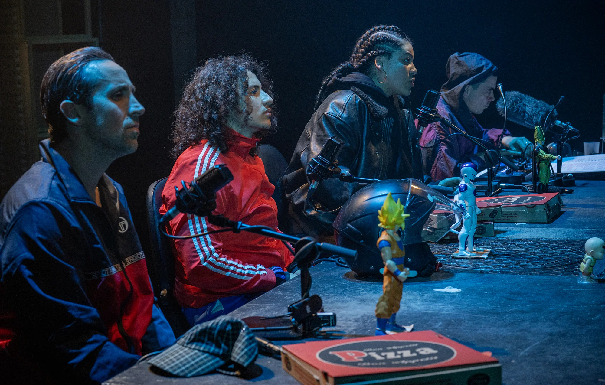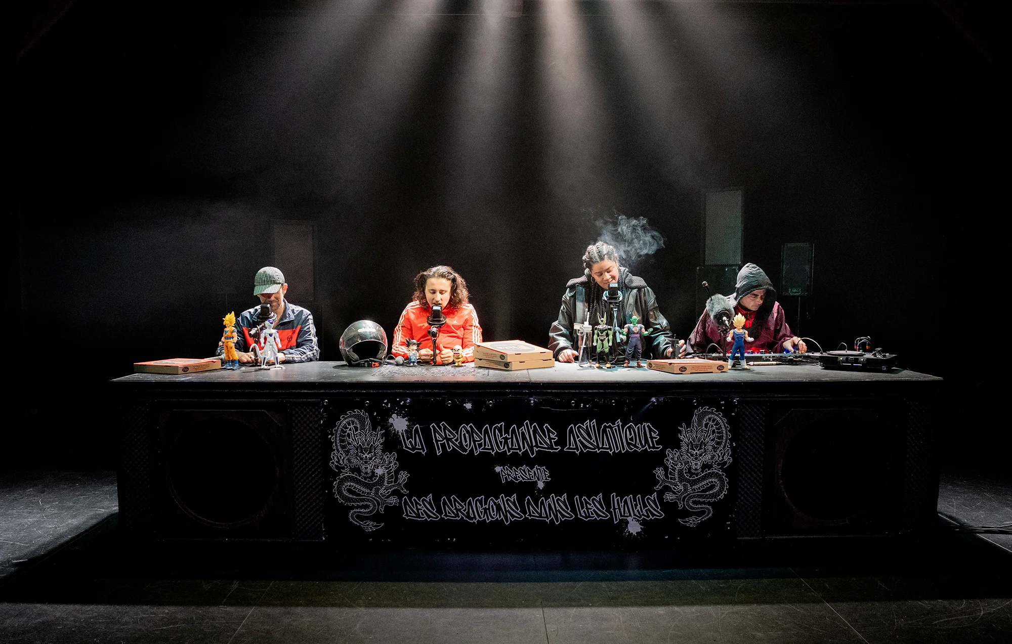 On avait laissé Julien Villa entre Rodez et Mexico, sur les traces du sous-commandant Marcos.Poursuivant sa trilogie sur les Don Quichotte des temps modernes, le touche-à-tout magnifique – auteur, romancier, metteur en scène, comédien – délire son adolescence depuis une table de radio live hiphop, où zonent parfois quelques figures de Dragon Ball Z échappées des écrans télés de l’époque. Ça rappe et ça dérape au fil d’une langue nerveuse et chorale qui fait défiler une galerie de losers urbains au parler cru. Entouré de deux jeunes comédiens et de son acolyte musicien Tristan Ikor, Julien Villa invente une poésie slamée des halls d’immeubles, dans une nouvelle facette de ses obsessions mythologiques.